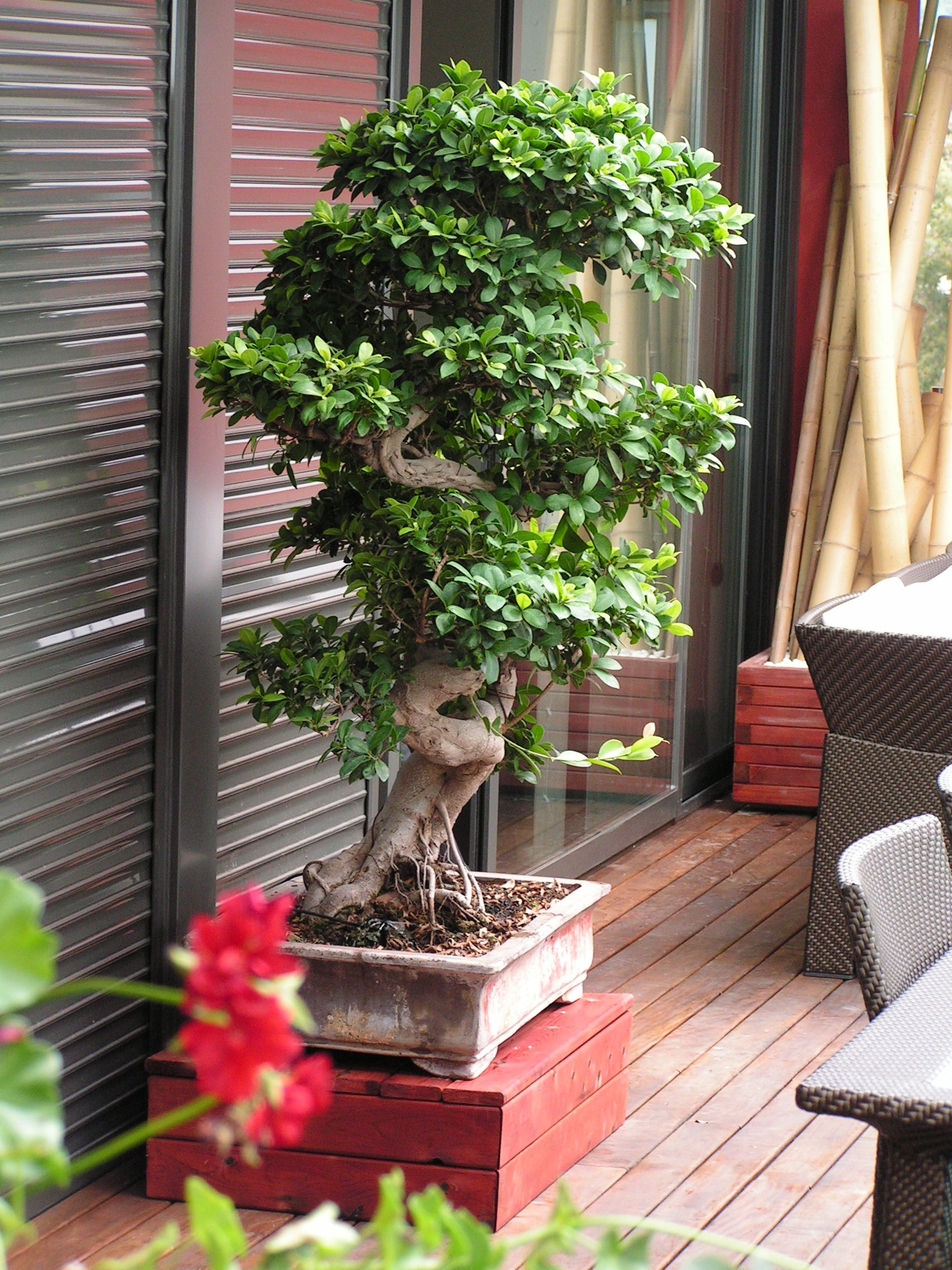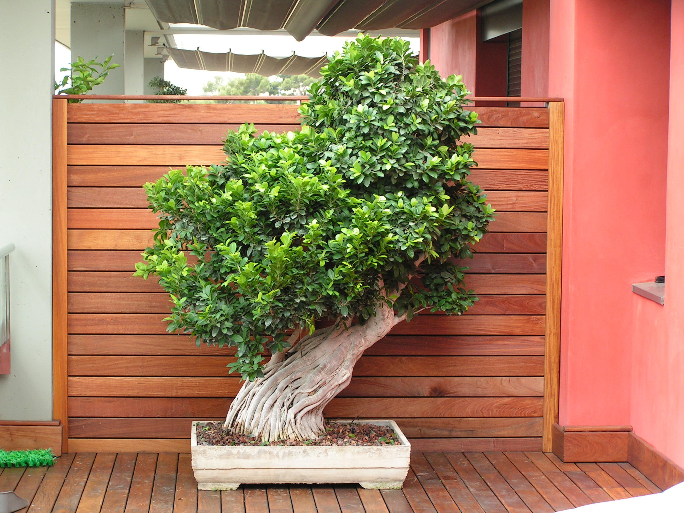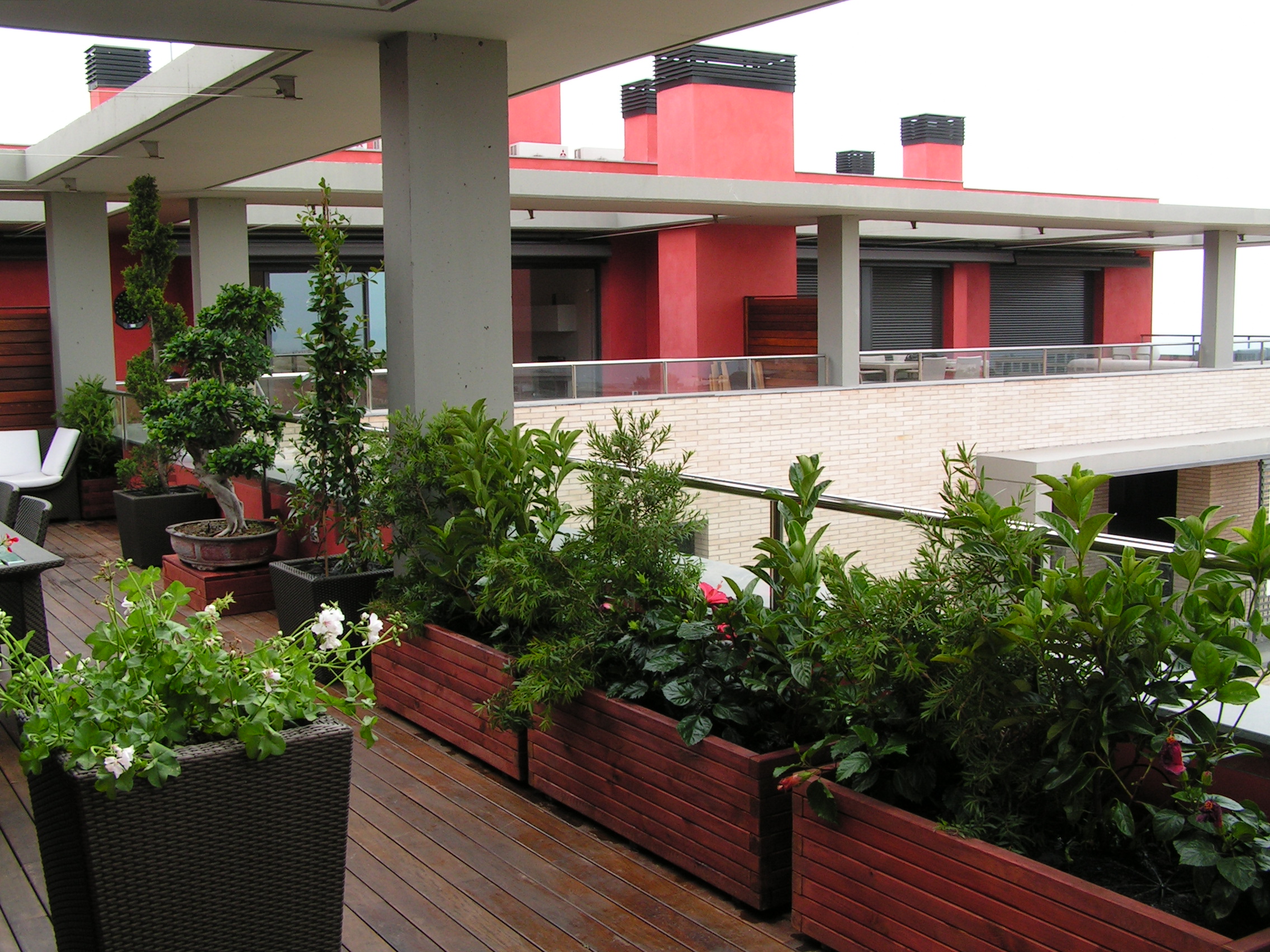 Jardineras grandes como para vivir cómodamente un árbol, plantas con flor muy cerca de casa.