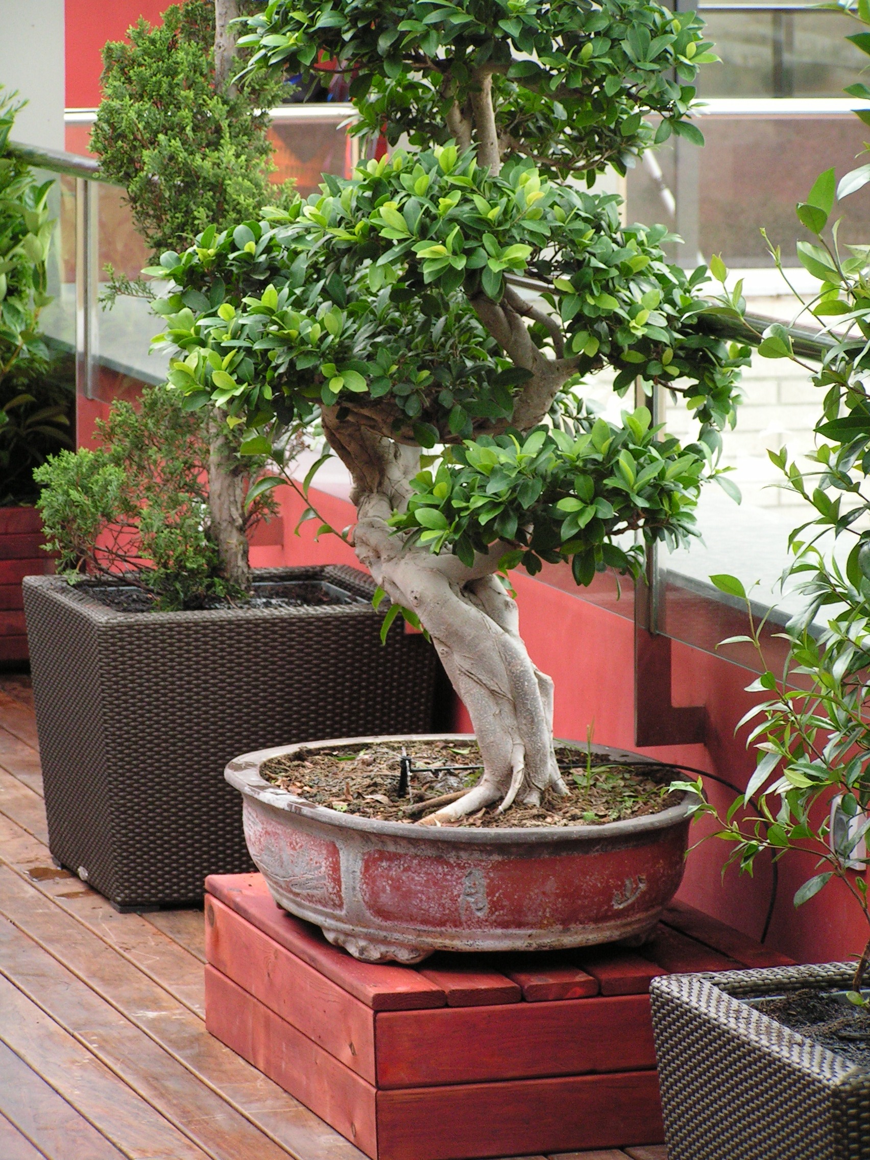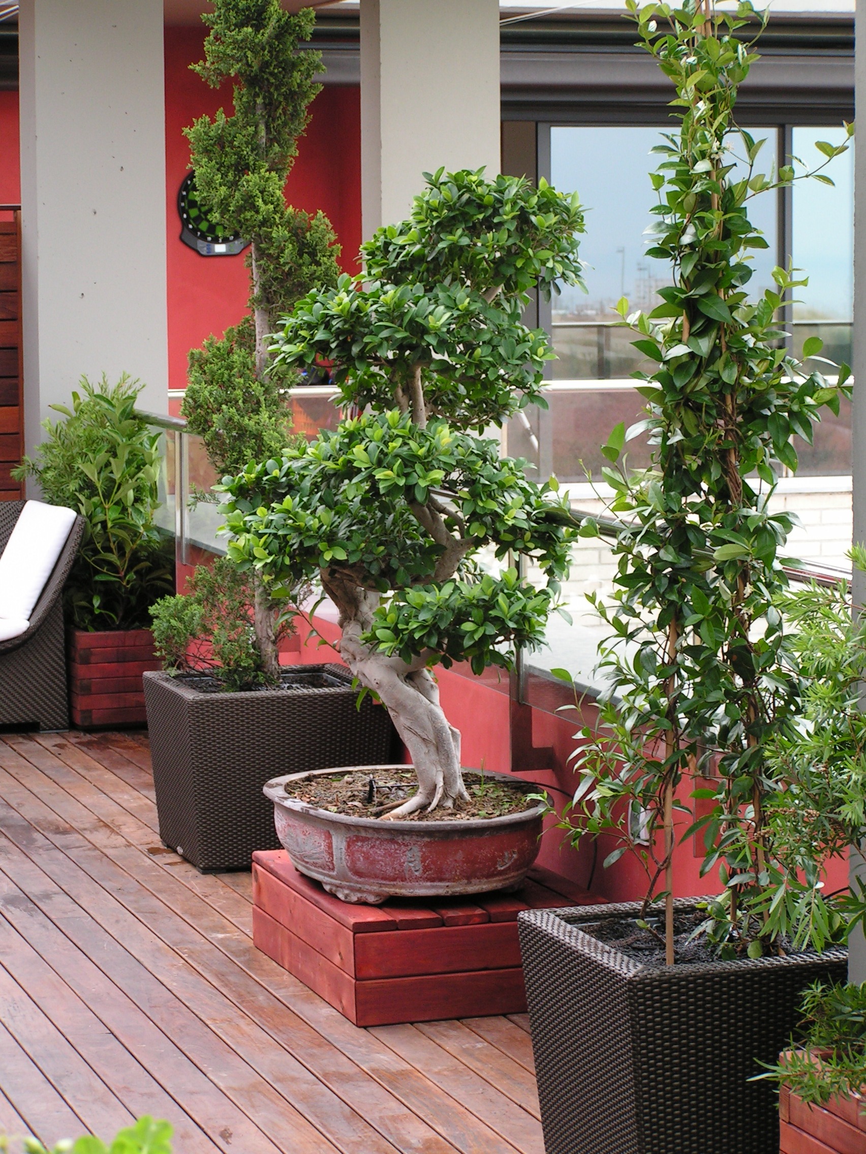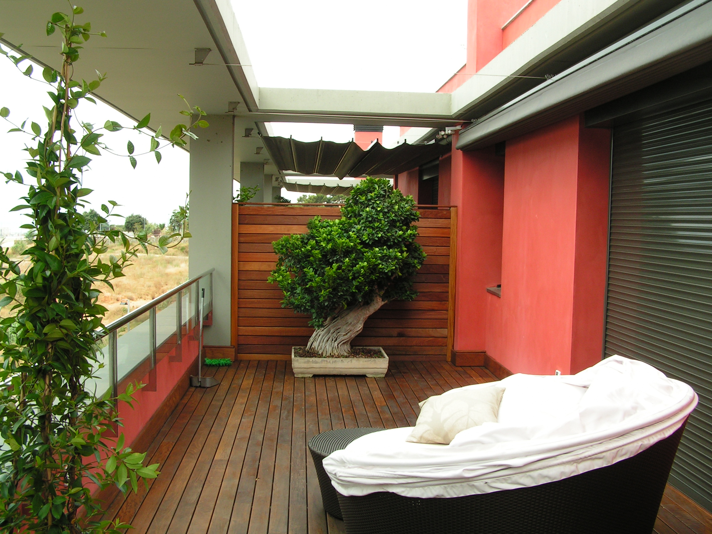 Jardineras grandes como para vivir cómodamente un árbol, plantas con flor muy cerca de casa.
